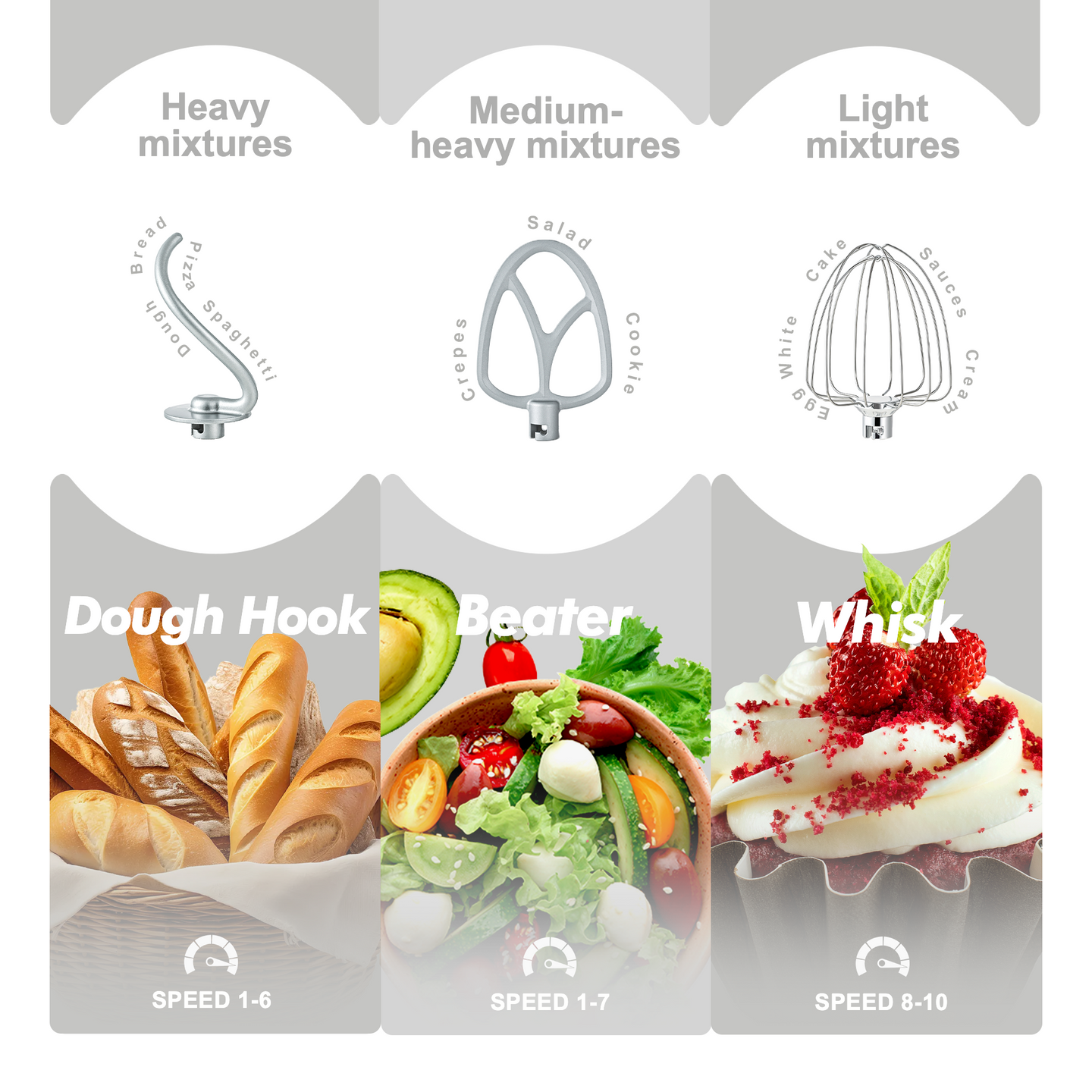 With 10-speed options, our kitchen mixer is suitable for mixing bread dough, thick batters, healthy salad, and whipping cake cream, which can be extremely beneficial for working with different ingredients as you need. And the Tilt-head design allows us to install or uninstall bowls and accessories easily.