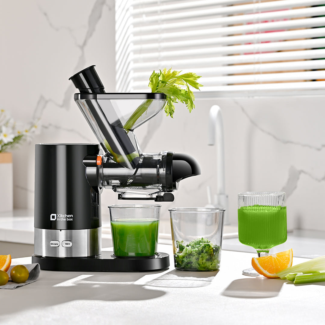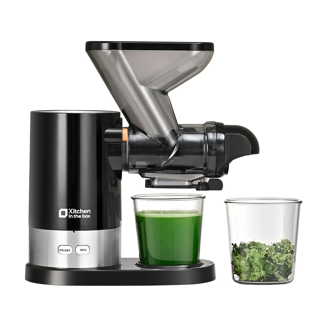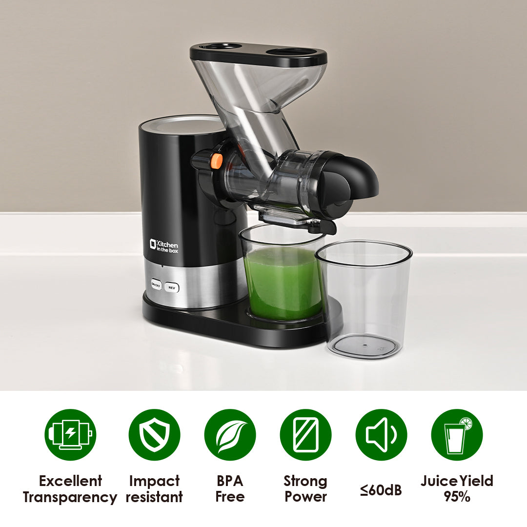 With the compact design, Kitchen in the box cold press juicer is an ideal option for those who have limited storage space or small families, making it easy to fit on any kitchen counter or in a cabinet. And the unique dual-feed chute allows you to put ingredients in at the same time, saving you precious time. The inclined feed channel is another innovative addition that makes the juicing process even more efficient, allowing the ingredients to flow easily toward the auger.
