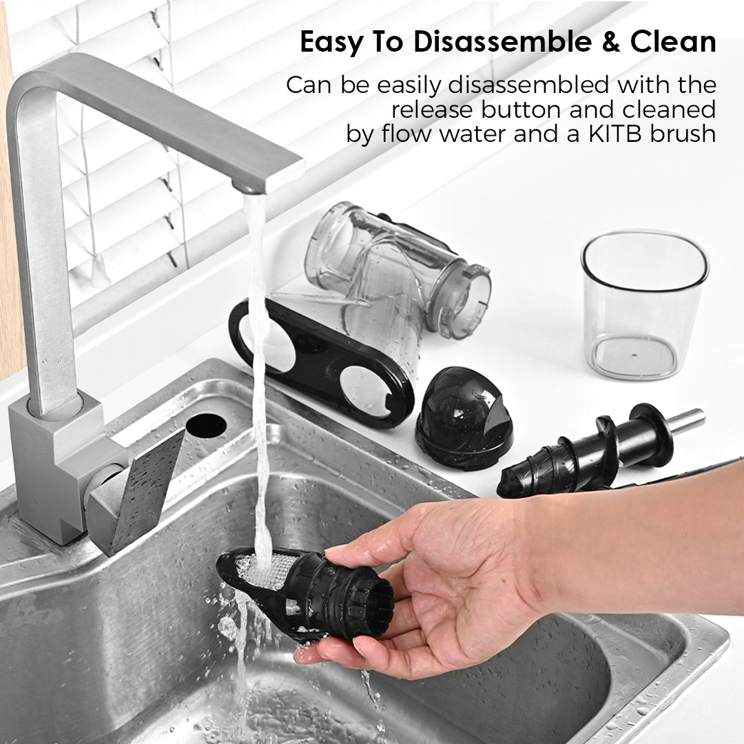 BPA Free-We take your health seriously, and that's why all detachable parts of our slow juice extractor machine are made of high-quality food-grade material. Tritan material is used, and it's BPA-free, making it a healthier choice for you. The parts of the compact juicer are easy to disassemble by pressing the release button and rotating the juicing body. All removable parts, especially the fine filters, are easy to clean with the flowing water and the cleaning brush equipped in the package.
