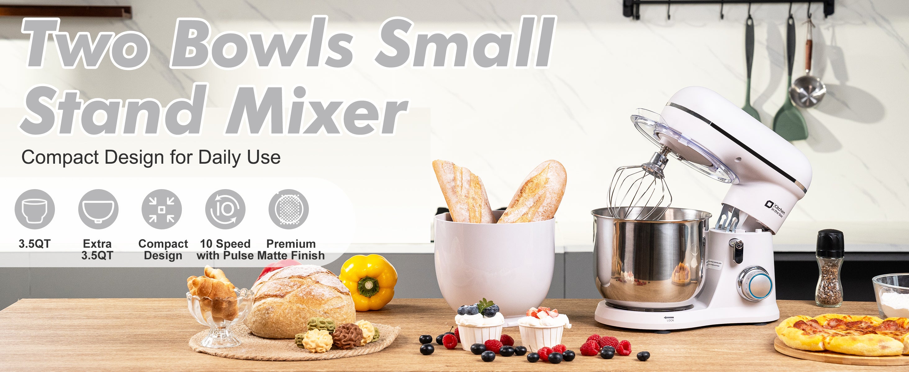 3.5QT Kitchen Electric Mixer with Matte Finish, Two Bowls, 10-Speed, Includes Egg Whisk, Dough Hook, Beater