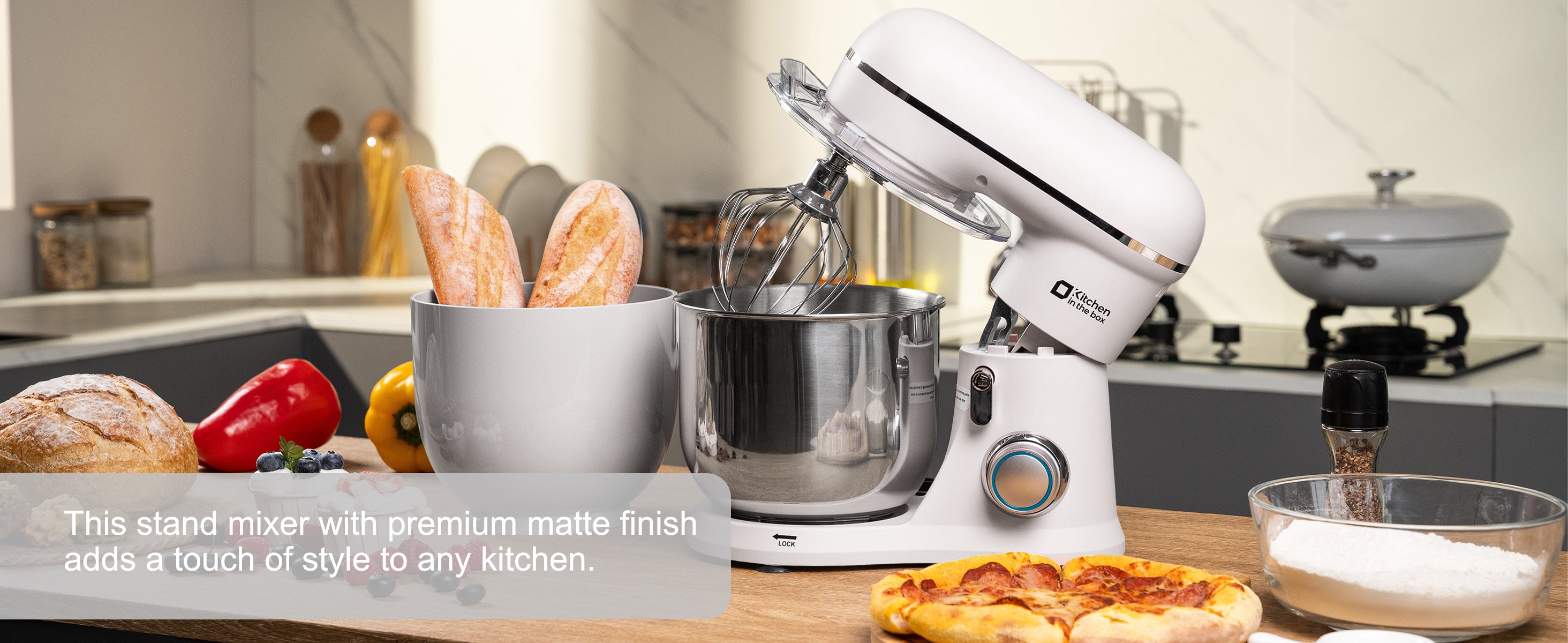 Designed with a modern matte finish, this kitchen stand mixer looks as good as it performs—available in multiple colors to complement any kitchen. It includes two mixing bowls for versatile baking and space-saving storage.