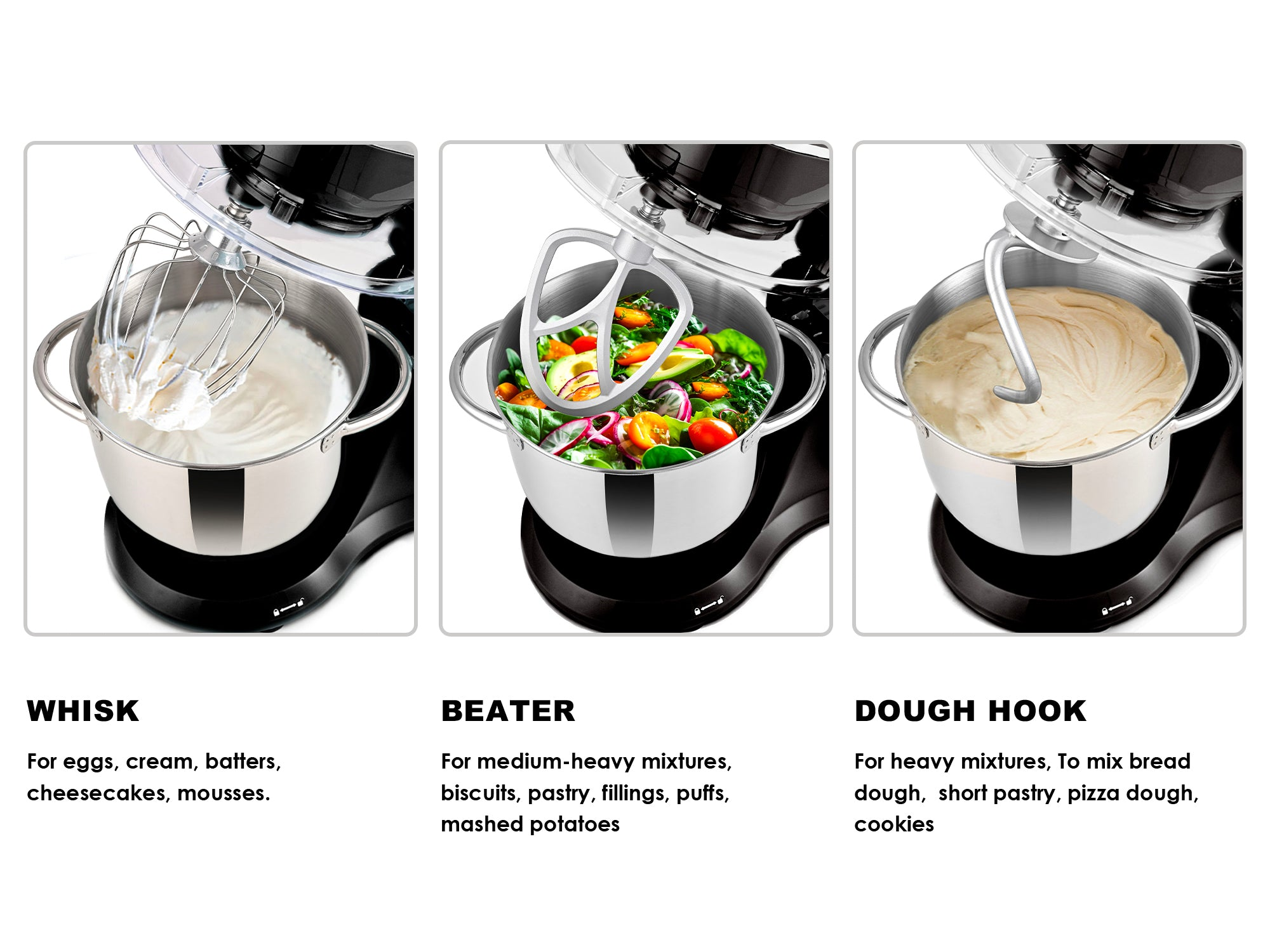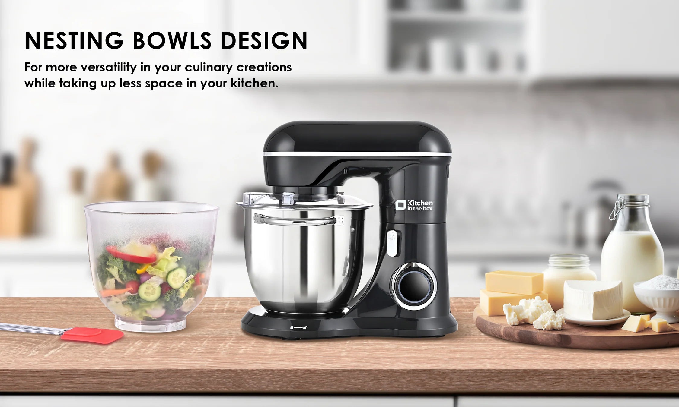 Designed with a modern matte finish, this standing mixer looks as good as it performs—available in multiple colors to complement any kitchen. It includes two mixing bowls for versatile baking and space-saving storage. 10 speed settings and dishwasher-safe attachments make your baking effortless.